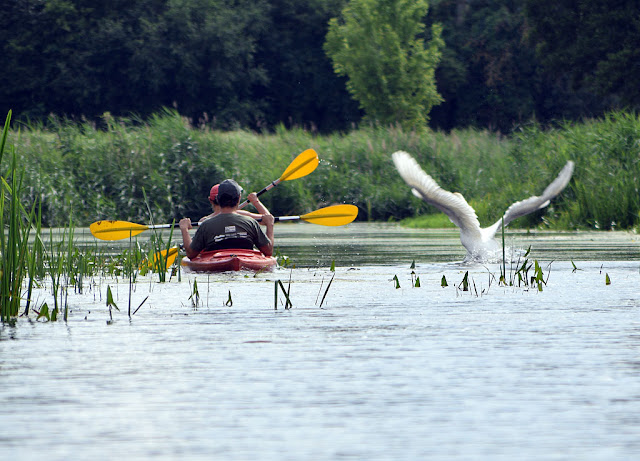 Kawałek dalej zaczyna się teren mocniej zadrzewiony. Doganiamy rodzinę łabędzi. Gdy pierwszy kajak z naszej grupy go mija, to samiec próbuje odstraszać, atakować, bije skrzydłami o wodę i syczy. Samica z młodymi odpływa gdzieś w bok i łatwo ją wszyscy wyprzedamy. Samiec jednak podąża cały czas kilka metrów przed pierwszym kajakiem, ciągle i ciągle podejmując próby odciągnięcia nas, choć już dawno minęliśmy jego rodzinę. Dopiero po dobrych dwóch kilometrach nagle robi zwrot o 180 stopni, syczy jeszcze na wszystkich i wraca. Tak jakby dopiero tu skończył się jego rewir.